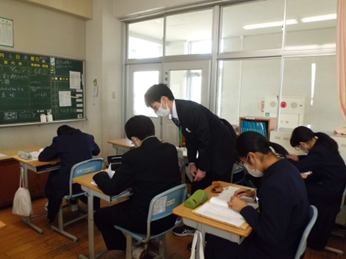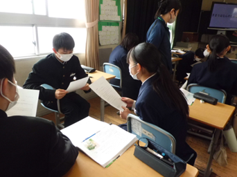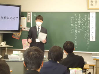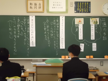 2025年11月5日 12時46分『二通の手紙』という資料を使って、規律ある安定した社会の実現を目指すために、きまりや法の意義について深く考え、主体的に守ろうとする態度を育てることをねらいとした授業でした。先生自身の経験や、教科書以外の資料なども提示しながらの授業で、生徒たちも自身のことを振り返ったり、友人と話し合ったりして、じっくり考えることのできる授業でした。