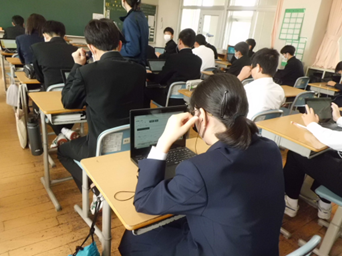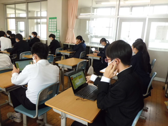 英語の学習の定着度を見るテストが、CBT方式(Computer Based Testing )で行われました。読む、書く、聞くのみならず、話す力も見ることのできるものです。愛媛県下全中学校で行われるため、後日行われる結果分析をみれば、自分の力を客観的に知ることができます。入学試験に臨む3年生にとっては、自身を振り返り、今後の学習をどう進めていくか考える良い機会となりました。