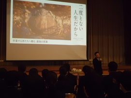 「二度とない人生だから」という坂上真民さんの詩を軸にして、挫折しそうになっても、つらくても、自分の夢を諦めずに前を向いて歩んでいってくださいという校長先生からの熱いメッセージが伝わってくる授業でした。何人もの生徒が、自身の最近の挫折やそれを乗り越えた経験、さらにこれからの夢についてみんなの前で語れて、さすが小野中三年生と頼もしく思いました。
