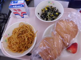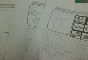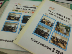 また、本日は3年生の義務教育最後の給食となりました。献立は「パン 牛乳、ミートスバゲティー、ヒジキサラダ、いちご」でした。9年間お世話になった久米調理場の方々に感謝のメッセージも作成し、皆で味わっていただきました。